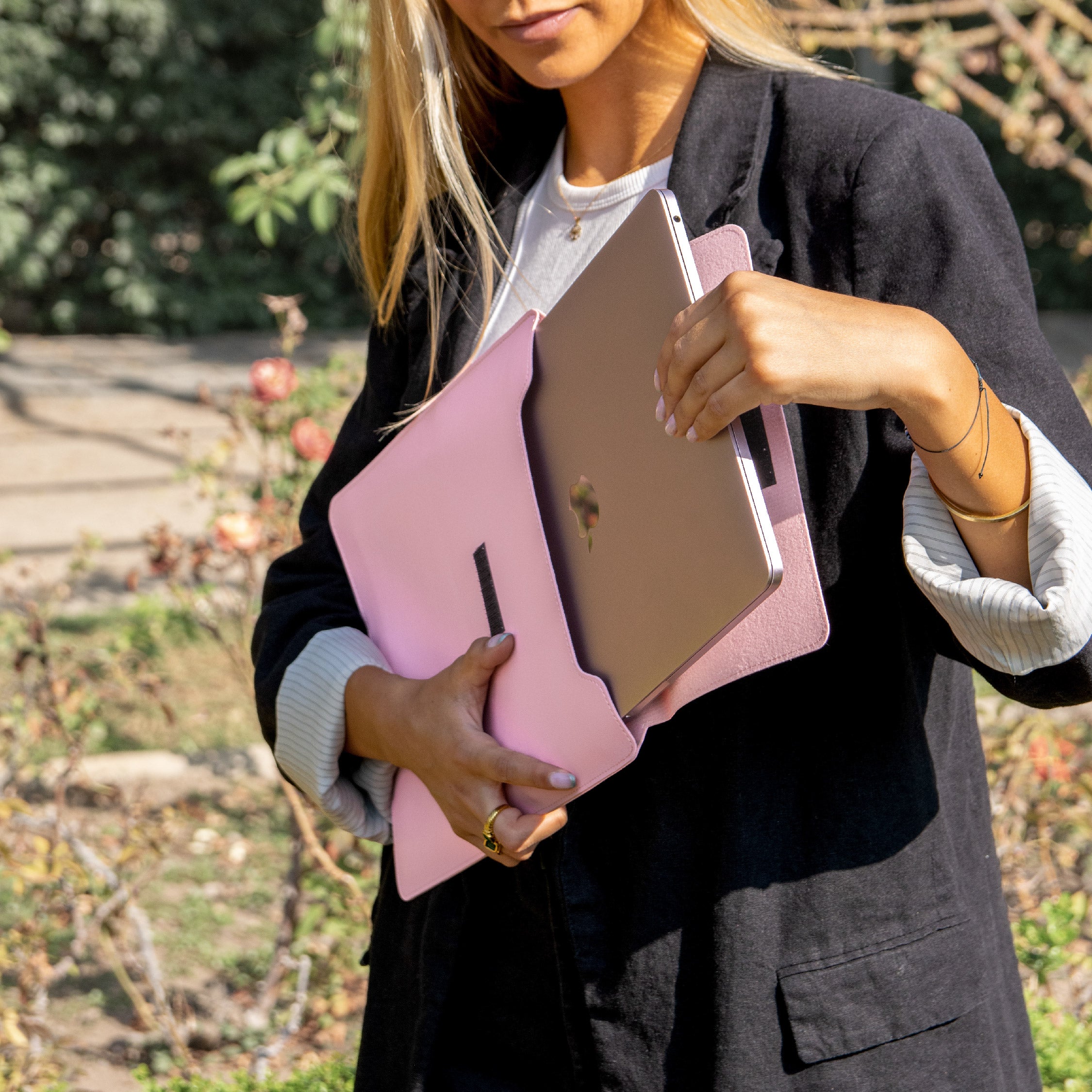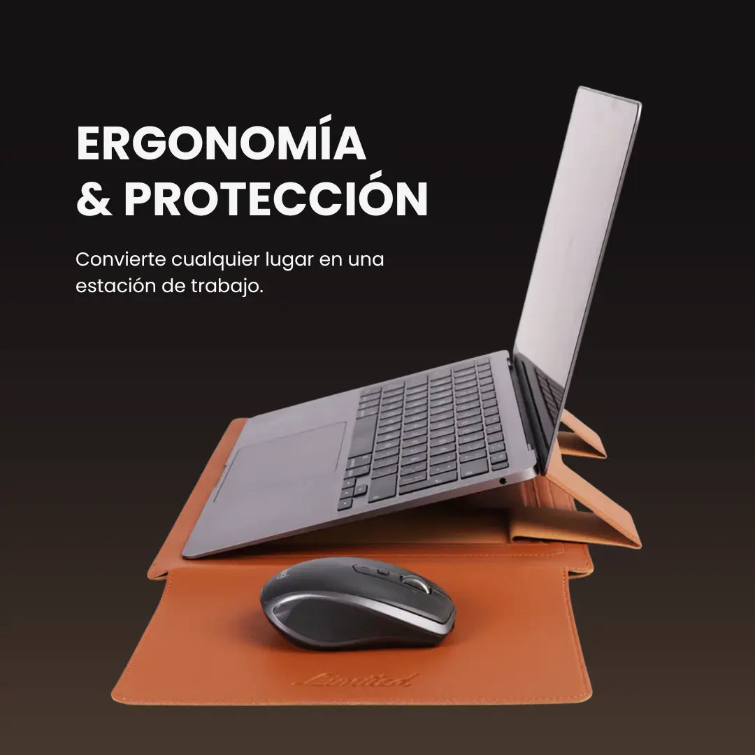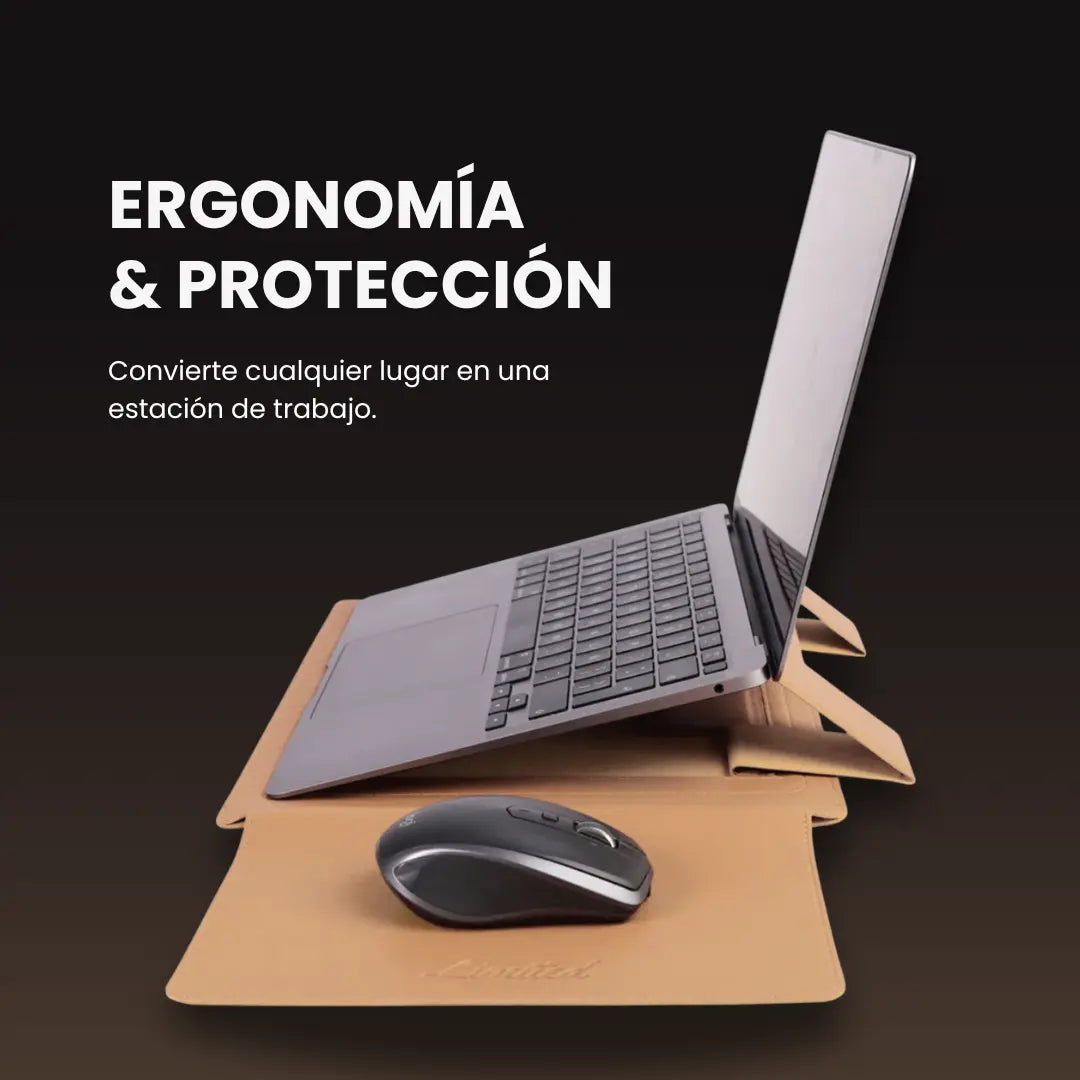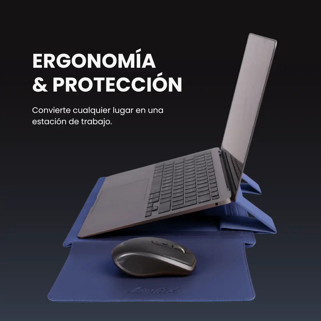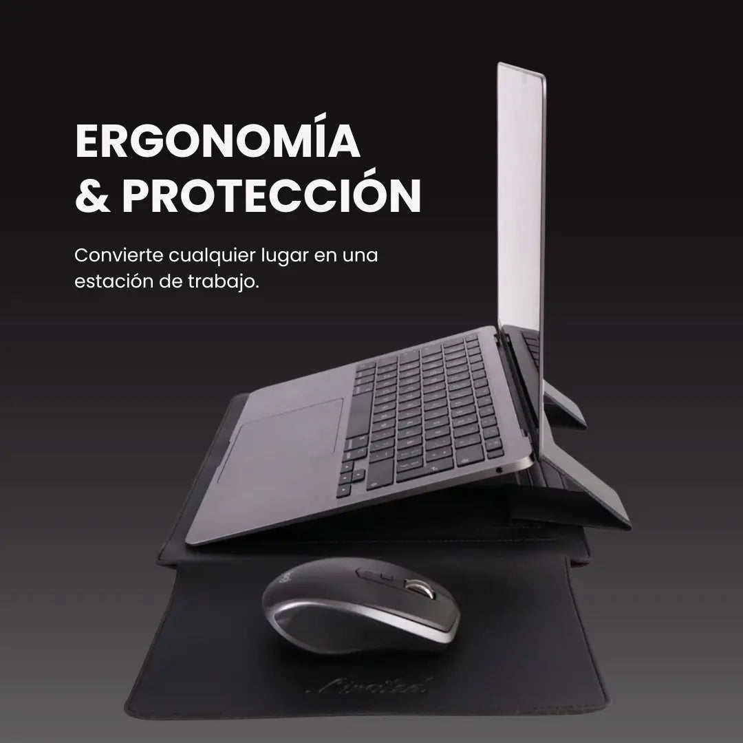 Esta funda no solo protege tu notebook: se transforma en una estación de trabajo portátil. Con su diseño plegable, eleva tu pantalla a la altura ideal para cuidar tu postura, y se adapta a cualquier superficie.