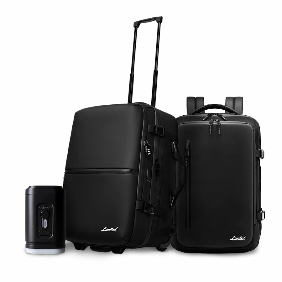 ¡Pack Ventus! Viaja más ligero, ordenado y sin estrés. Este set reúne tres esenciales de Limited pensados para moverte todos los días y también para escapadas: la mochila Ventus y la carry-on Ventus, ambas con sistema de vacío integrado, y la Aspiradora Portátil para mantener todo impecable.